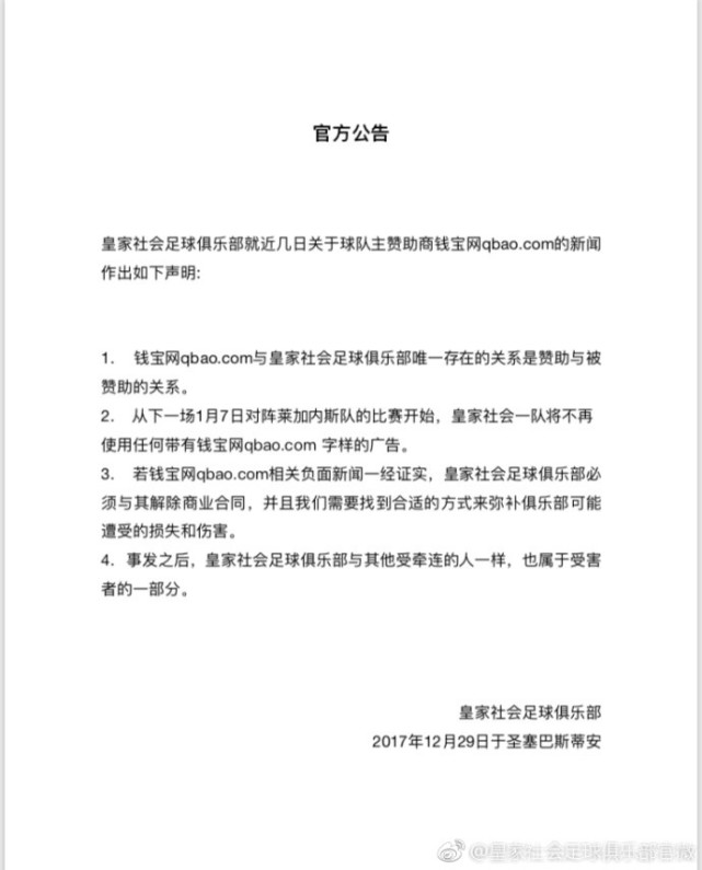 2.从下一场1月7日对阵莱加内斯的比赛开始,皇家社会一队将不再使用任何带有钱宝网qbao.com字样的广告。