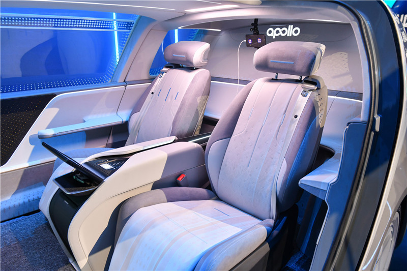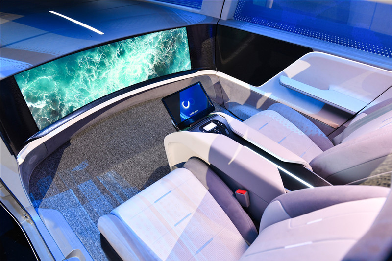 车内没有方向盘、踏板,超大曲面屏、智能控制台、变光玻璃、零重力座椅等智能化配置流露出浓浓的未来感。