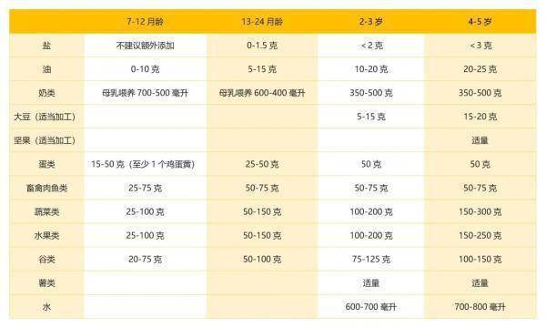 中国营养学会推出的7-24月龄以及学龄前儿童的膳食标准为: