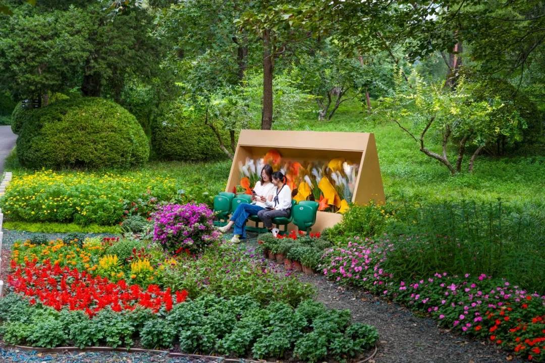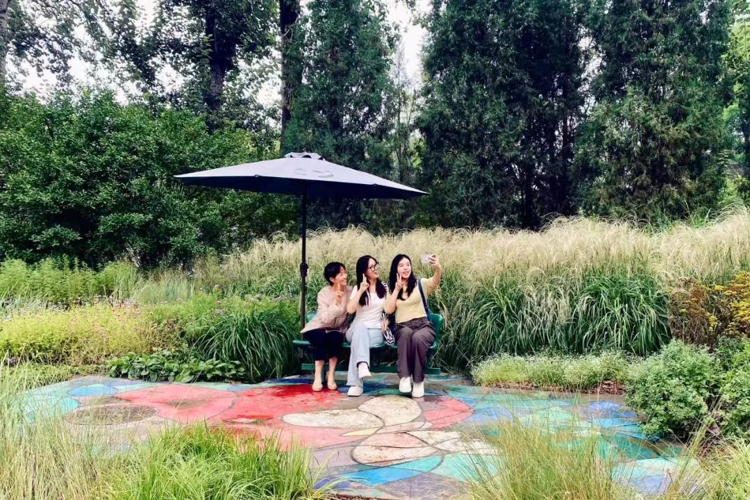 在北京动物园西北部直筒河北岸有一组“万生之缘”花境,花境设置了5个主题观赏点,分别以植物组团的形态语言演绎“谷麦”“桑蚕”“蔬菜”“果木”和“花卉”主题。通过植物高低错落的层次、四季轮换的景观变化,实现“人步入画、画随人动”,让游客步入其中体验沉浸式的悠然之意。一组绿色的天安门广场观礼椅添置其中,上面搭配一把遮阳伞,地面彩绘“彩蝶之舞”,与宿根花卉相映成趣,一经搭建便立刻吸引来游客拍照留念,成了“最美打卡地”。