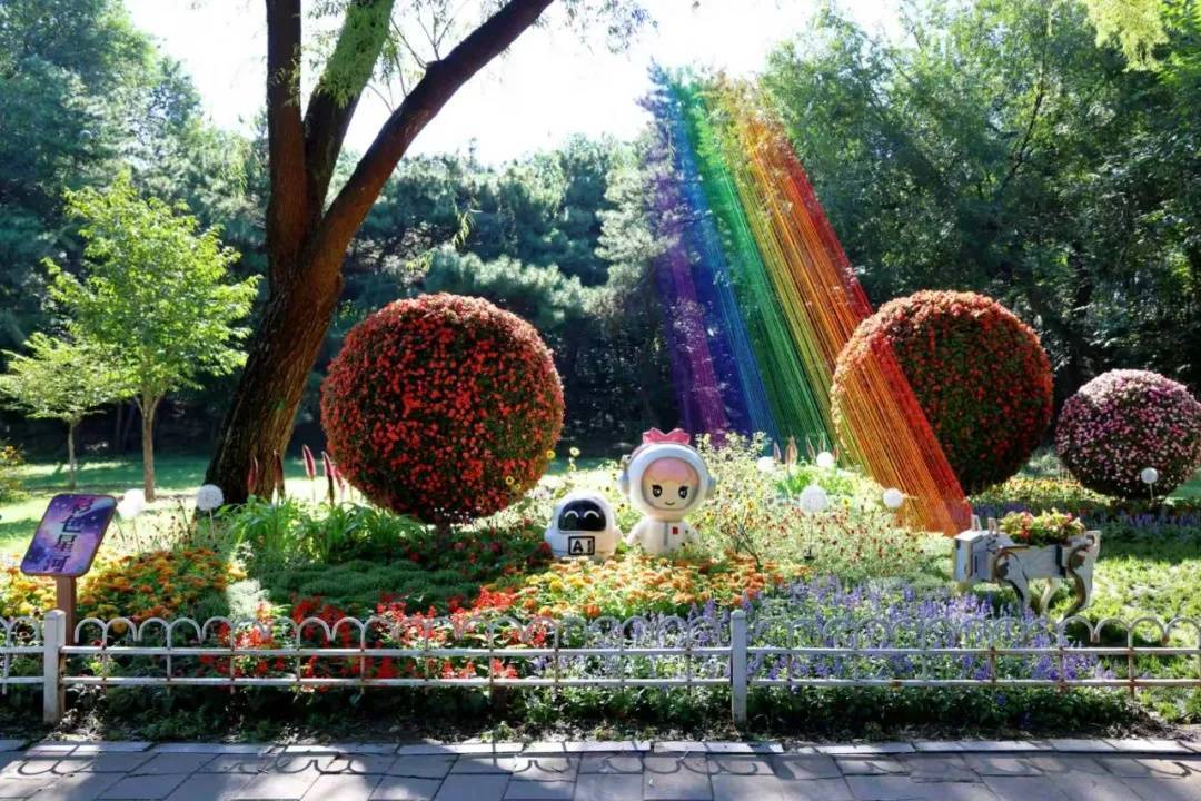 位于玉渊潭公园西北门的一处特色花园造景“彩色星河”刚一亮相就吸引了众多游客市民打卡拍照。该造景占地150平方米,以花卉营造出绚烂“星河”意象:倾泻而下的“彩虹”由10种颜色的丝线编织而成,仿佛连接了天地。球状花簇似星光闪烁,与渐变花丛构成的“星云”相映成趣,形成一片梦幻景观。值得一提的是,场景中特别设置了宇航员“小樱”、AI机器人及“机器狗”花钵,为自然景致注入科技活力,展现科技与园林艺术融合的创新理念。这一别具一格的秋日景致,为游客市民带来沉浸式游园体验,也成为拍照打卡的新热点。