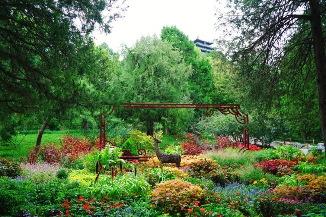 位于景山公园东门西南侧坡地的“日月照京华 景上更添花”主题花境于近日亮相。该花境依托原有林间地貌,巧妙运用了中国传统造园手法中的“借景”艺术,将远处的万春亭与周边葱郁的林木自然融入景观,形成一幅优美画卷。花境中选用了彩叶草、千日红、香彩雀等24种共计3800余株花卉,通过高低错落、疏密有致的搭配,营造出色彩斑斓、层次丰富的花带。更为巧妙的是,花丛中还点缀着一对俏皮的梅花鹿装饰,平添盎然野趣,仿佛它们正沉醉于这片花海之中。